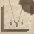 Radiate timeless sophistication with this exquisite gold-tone jewelry set. The necklace features a graceful curved bar adorned with pave crystals, anchoring a central round stone and a stunning deep emerald-green pear-shaped drop wrapped in a sparkling halo. The set includes matching drop earrings, making it a perfect choice for formal events or evening wear.
